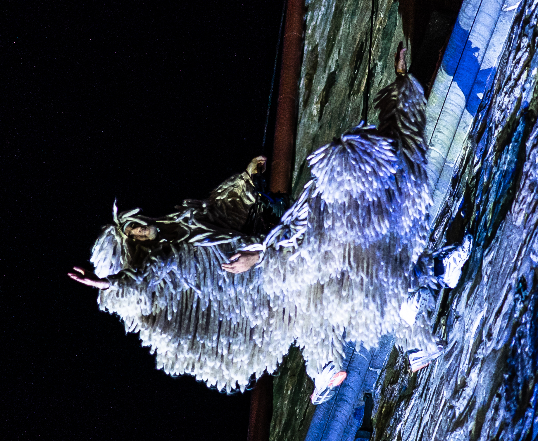 Åpningskonserten endte i en spektakulær avslutning med veggdans ved dansekompaniet Frikar i samspill med Ragnhild Hemsing, som spilte fiolin i klokketårnet.